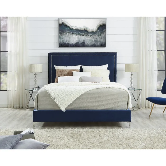 Navy Blue Solid Wood King Upholstered Velvet Bed with Nailhead Trim