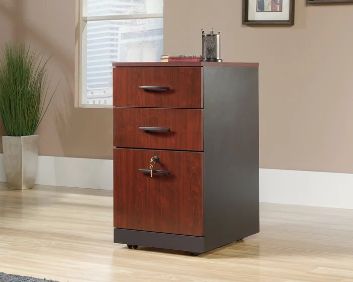 Via 3-Drawer Pedestal in Classic Cherry/Soft Black – Locking File Cabinet with Hidden Casters, 2 Utility Drawers & Legal File Storage “