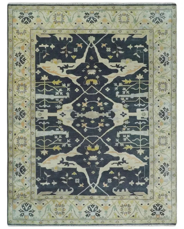 Custom Made Hand Knotted Oriental Oushak Charcoal, Ivory and Olive Wool Area Rug