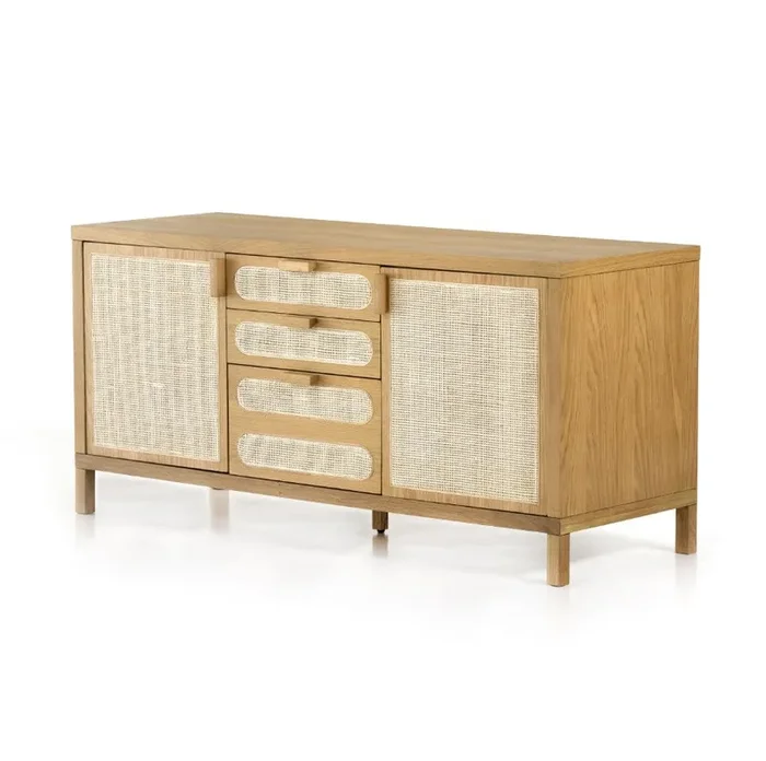 This wooden side table offers 2 pull-out drawers, open shelf cubbies, and 1 enclosed cabinet, making it the perfect accent for any living or bedroom space.
