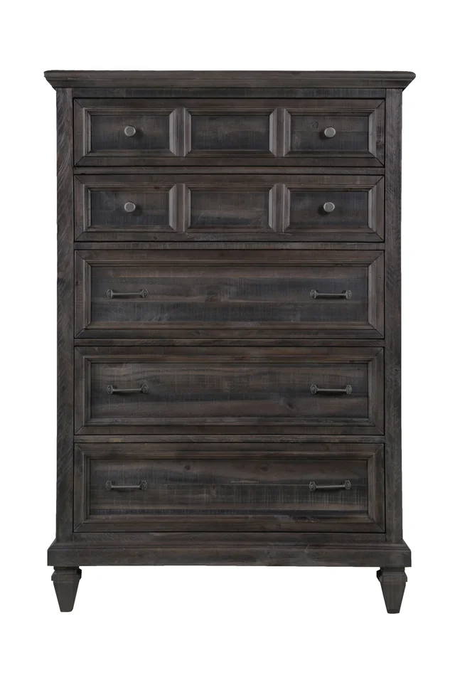 This bedroom set has been built with distressed mindi solids and veneers, full extension ball bearing drawer guides and genuine slate accents. Available as panel bed or bookcase storage